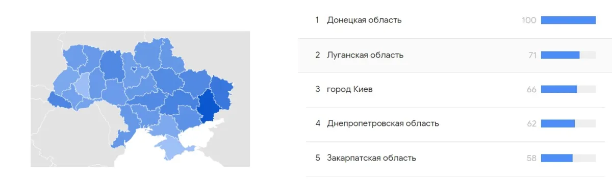 Сервіс Google Trends надав звітні дані, які стосуються частотності та кількості запитів пошуку за запитом «онлайн казино» на території України. У серпні 2024 року найчастіше ігрові майданчики шукали жителі донецької області, яка отримала від сервісу 100 балів.